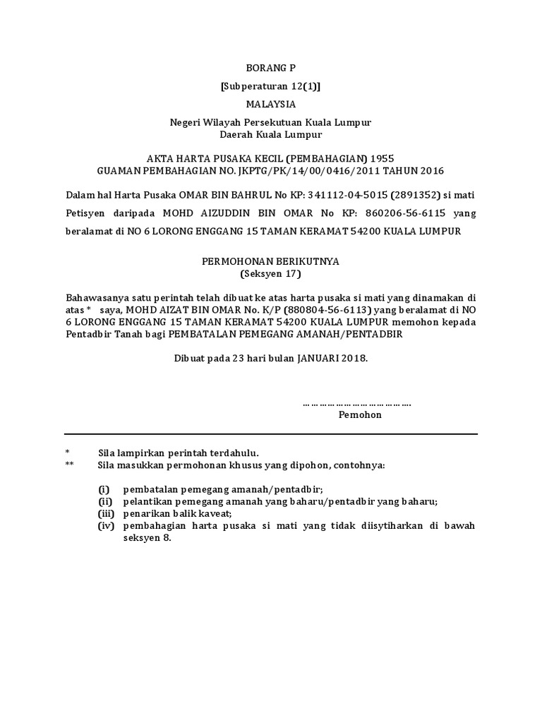 Borang P Pusaka Doc Borang P Peraturan 12 1 Malaysia Negeri Johor Daerah Akta Harta Pusaka Kecil Pembahagian 1955 Guaman Pembahagian No Tahun 2019 Course Hero