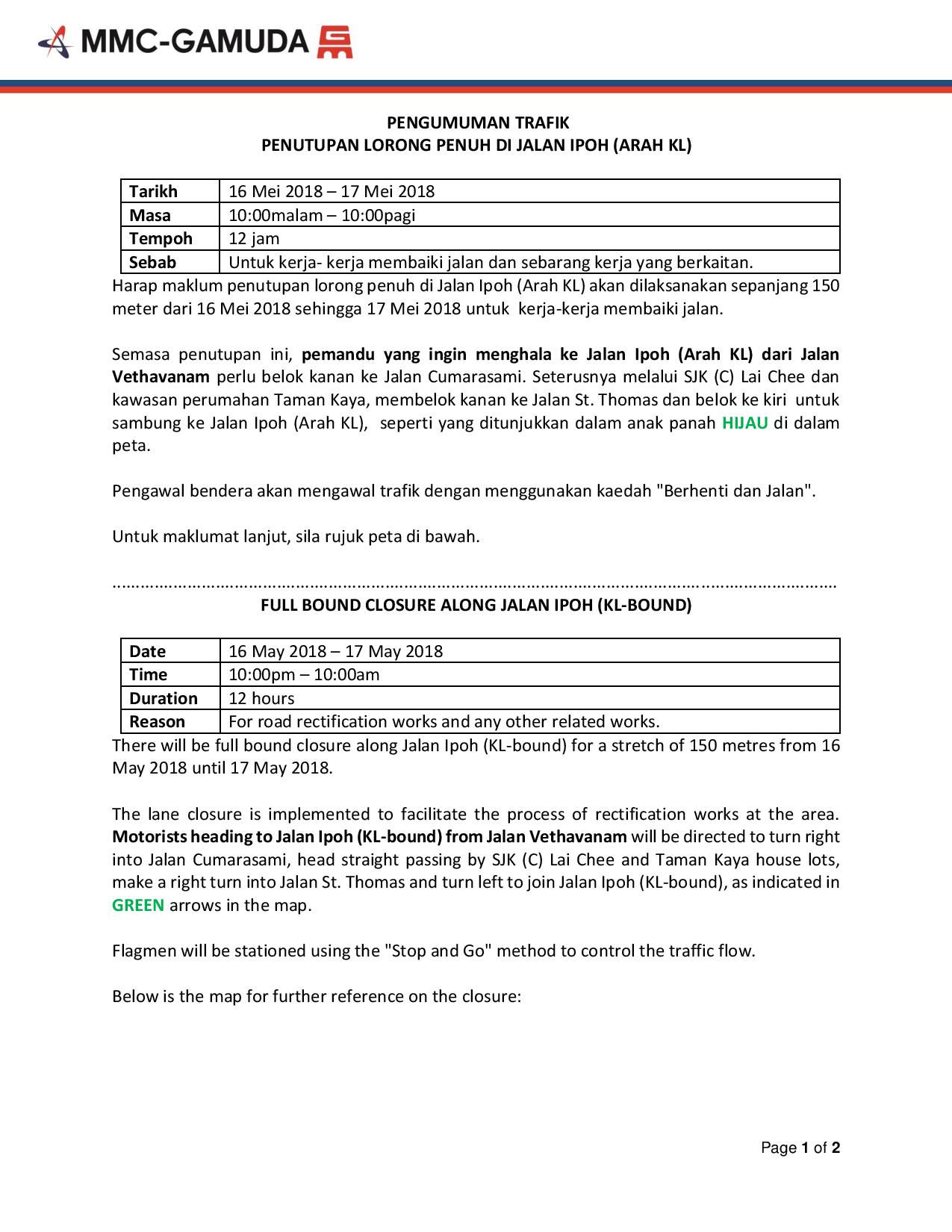 Mrt Corp On Twitter Full Bound Closure Along Jalan Ipoh Kl Bound Date 16 May 2018 17 May 2018 Time 10 00pm 10 00am Duration 12 Hours Reason For